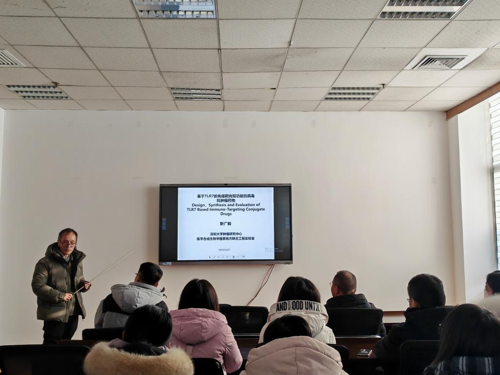 学术交流环节,靳广毅博士做了题为《基于TLR7的免疫靶向双功能抗病毒抗肿瘤药物》的报告,报告围绕TLR7免疫激动剂的主要应用展开。报告过程中,靳广毅博士还就如何开展科研实验、发表高水平论文与大家进行了交流和分享。
