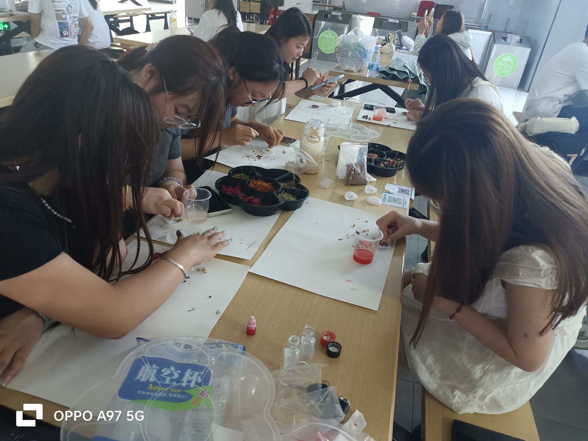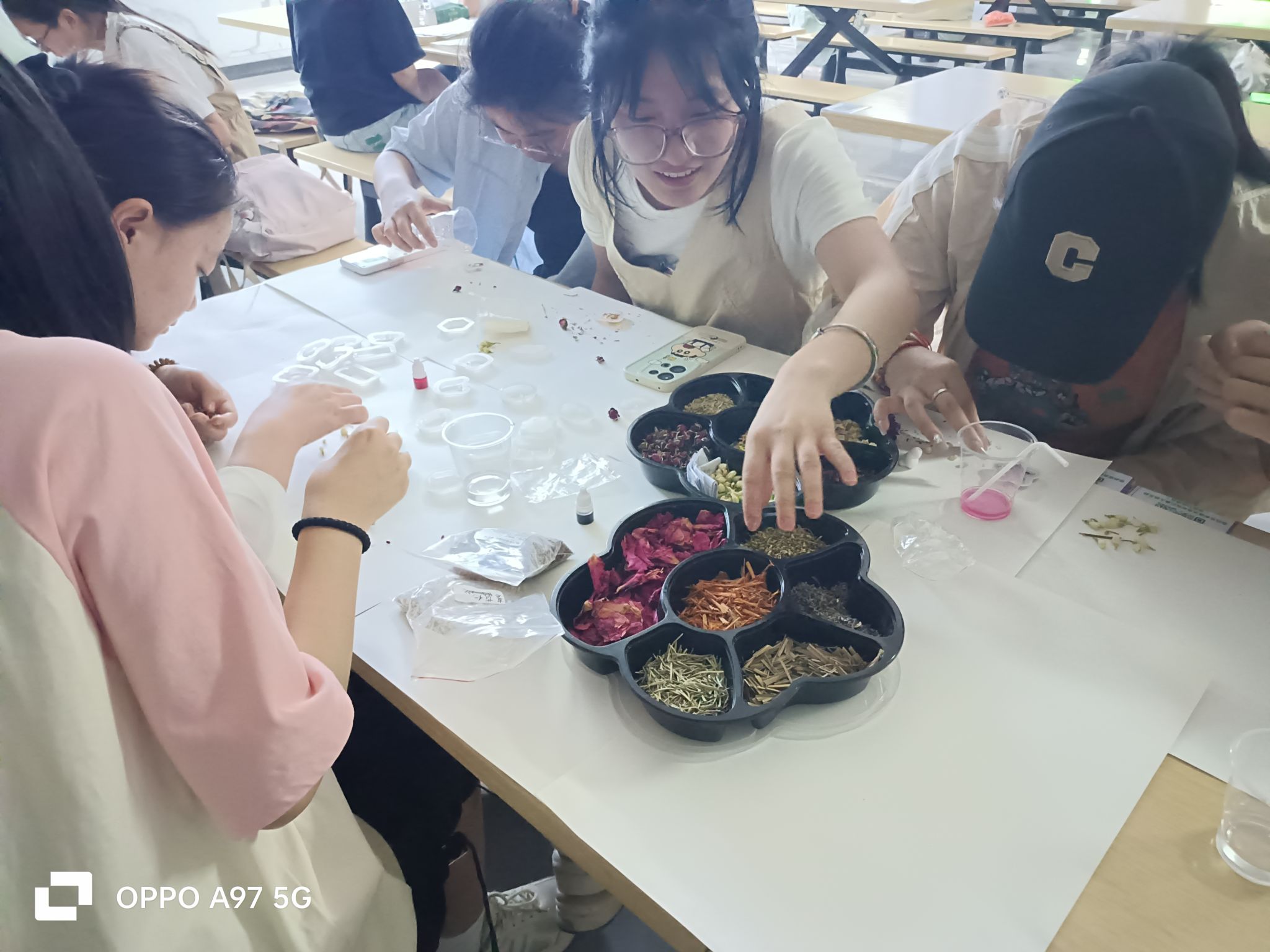 (2)参赛者选取模具和药材,将小塑料杯中的胶倒入模具中进行制作,静置一段时间,等干透后进行下一步。